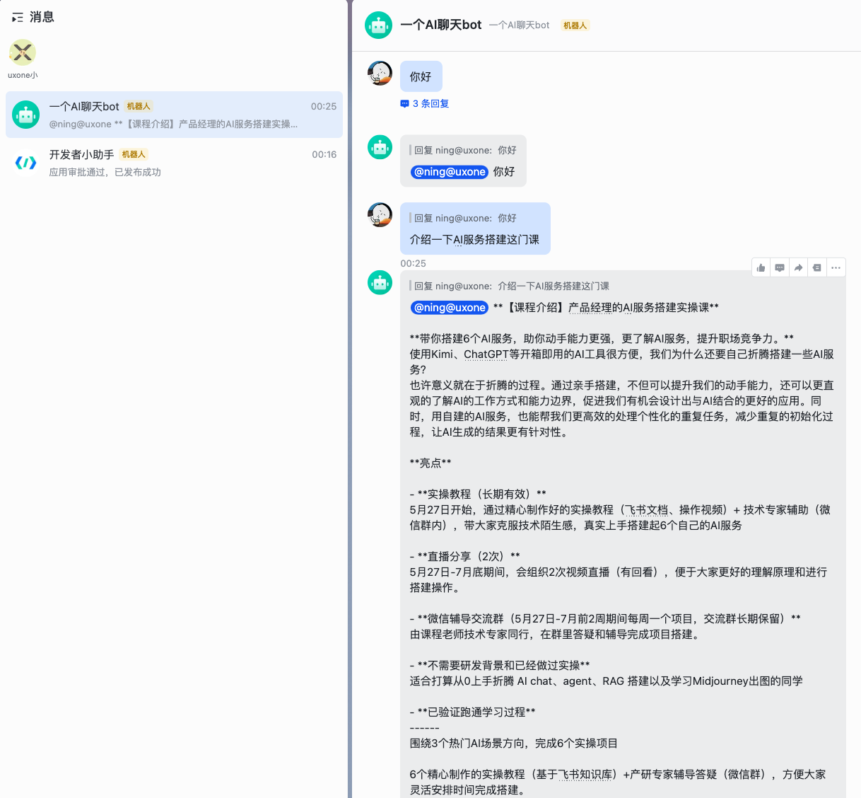 有些场景下,我们不方便使用扣子,但同样也可以让飞书应用具有AI能力,本项目将基于飞书开放平台和FastGPT,搭建具有AI能力的飞书应用。 搭建难度:中高 亮点